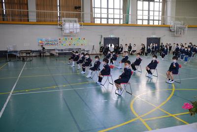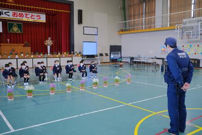 みんな、ドキドキワクワクしています。入場の際は、今年も6年生が手をつながずに、1年生をエスコ―トしました。1年生は一人一人しっかり返事ができました。立派な1年生です。今年も6年生が全員で、歓迎の思いを伝えてくれました。ダンス、合奏などのパフォーマンスで、6年生になったらこんなことできるようになるよというメッセージでした。校歌では1年生が後ろを向き、対面して在校生の歌を聞きました。小さい学校ならではの風景でした。式の後に、柏原駐在所員さんに今年も交通安全のお話もして頂きました。